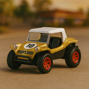 The legendary Meyers Manx dune buggy returns in Hot Wheels Premium’s Boulevard Series #108, bringing 1960s surf culture and rugged style in a show-ready package. Decked in a retro yellow and black colorway with a white roll cage and bold off-road stance, this tiny machine is made to conquer both sand and shelves.